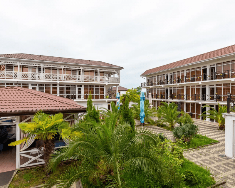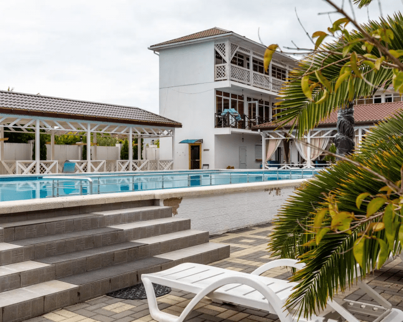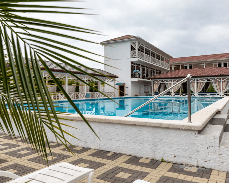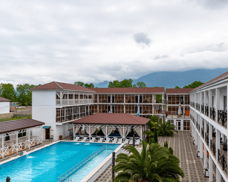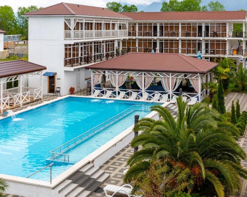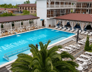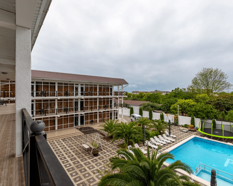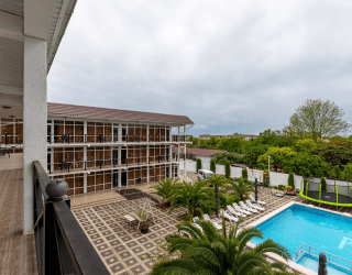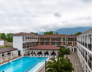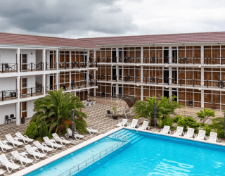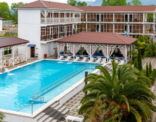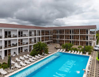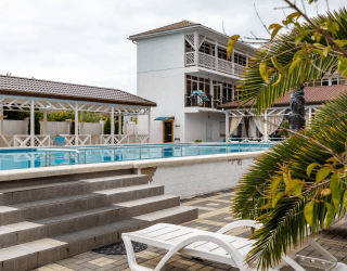 Территория отеля благоустроенная, закрытая и охраняемая. Для гостей предусмотрен большой открытый бассейн с подогревом, парковка для 20 машин и кафе, где гостям предоставляется комплексное 3-разовое питание.