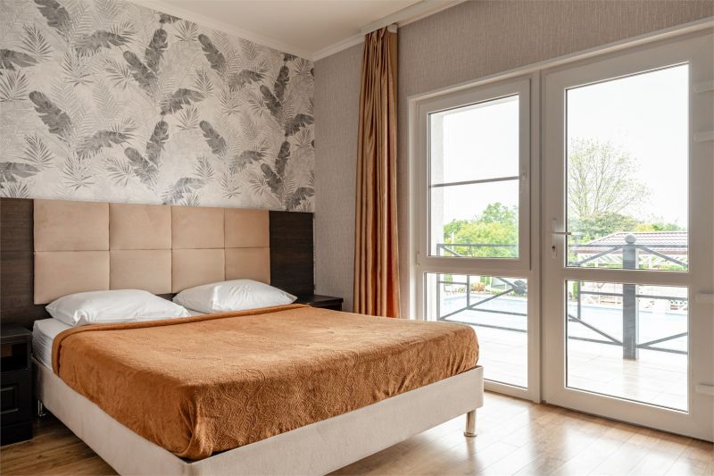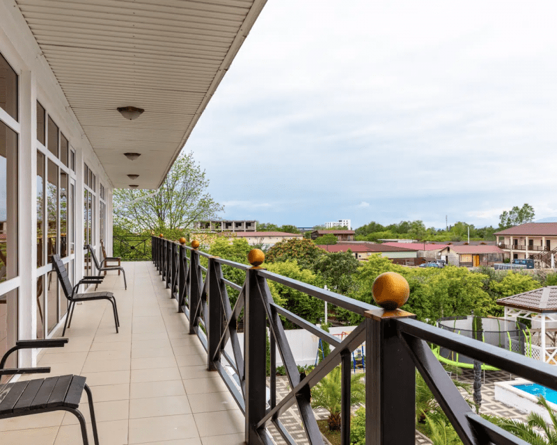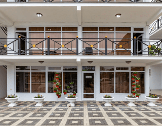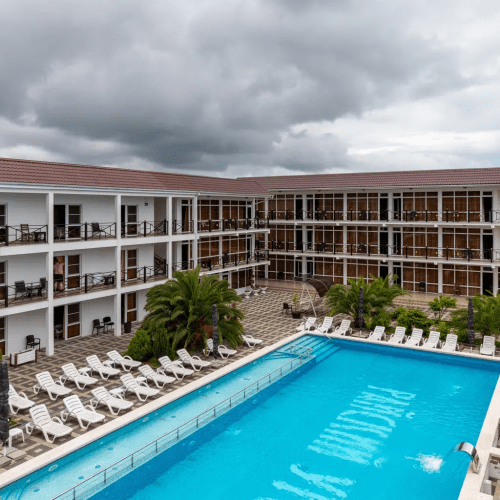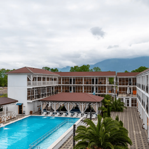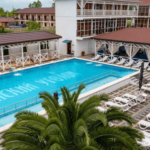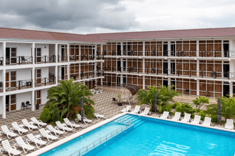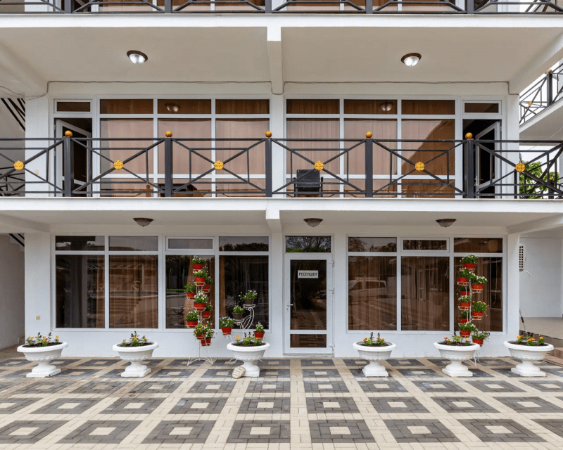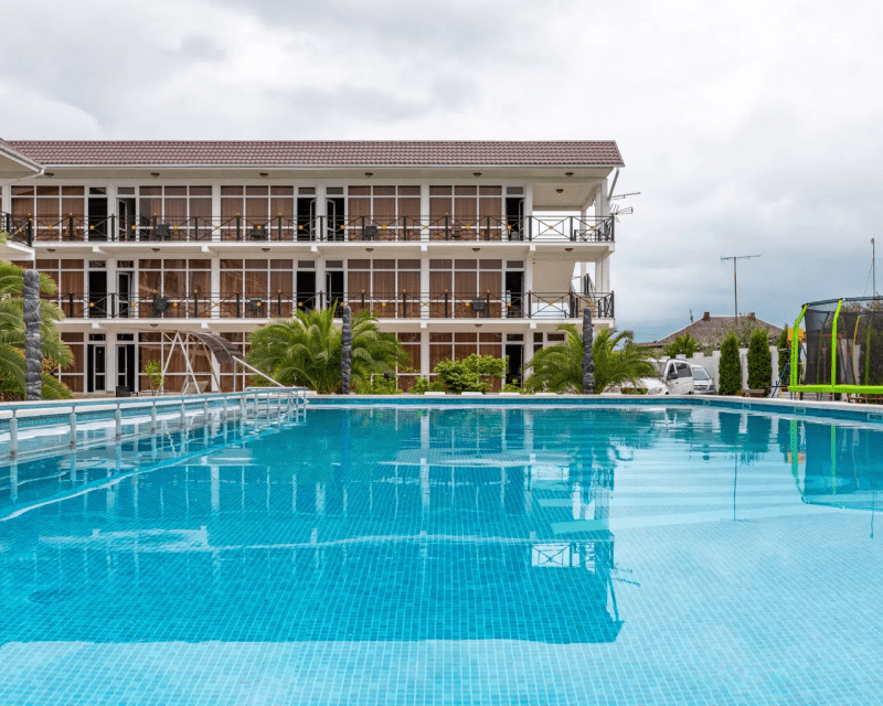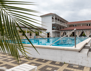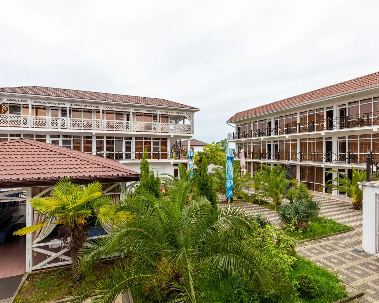 Территория отеля благоустроенная, закрытая и охраняемая. Для гостей предусмотрен большой открытый бассейн с подогревом, парковка для 20 машин и кафе, где гостям предоставляется комплексное 3-разовое питание.